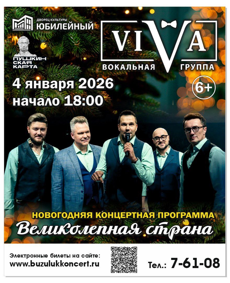 «Великолепная страна» – музыкальный новогодний проект известной российской группы VIVA. В программе любимые песни об истинных ценностях – семье, родине, патриотизме. В исполнении солистов VIVA в содружестве с городскими творческими коллективами «Стандарт», «Вдохновение», «Диамант», «Коктейль» прозвучат известные песни «Радуйся» (муз. Владимира Евзерова, слова Николая Денисова), «Тишина», авторские песни солиста и лидера группы Александра Балыкова.