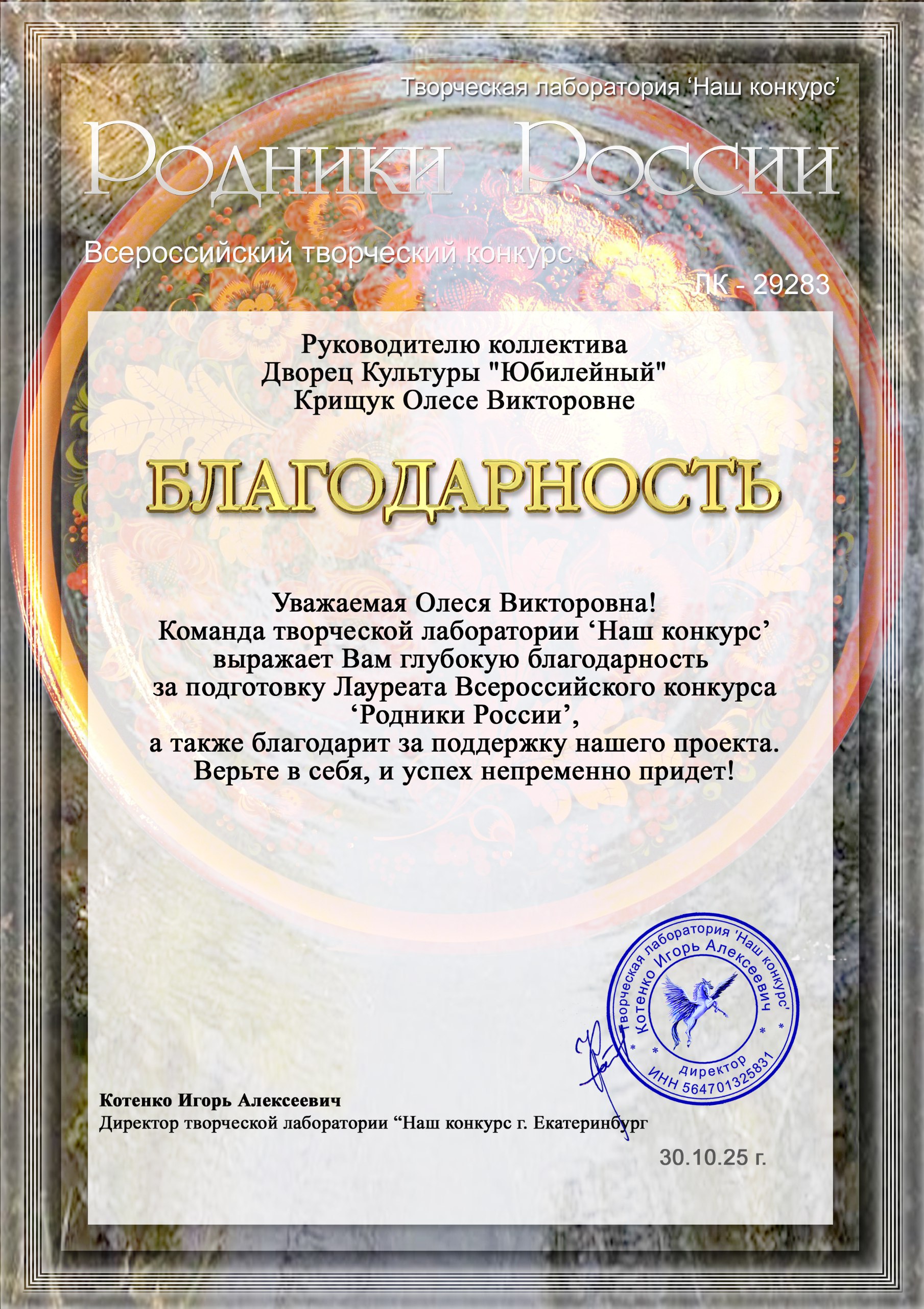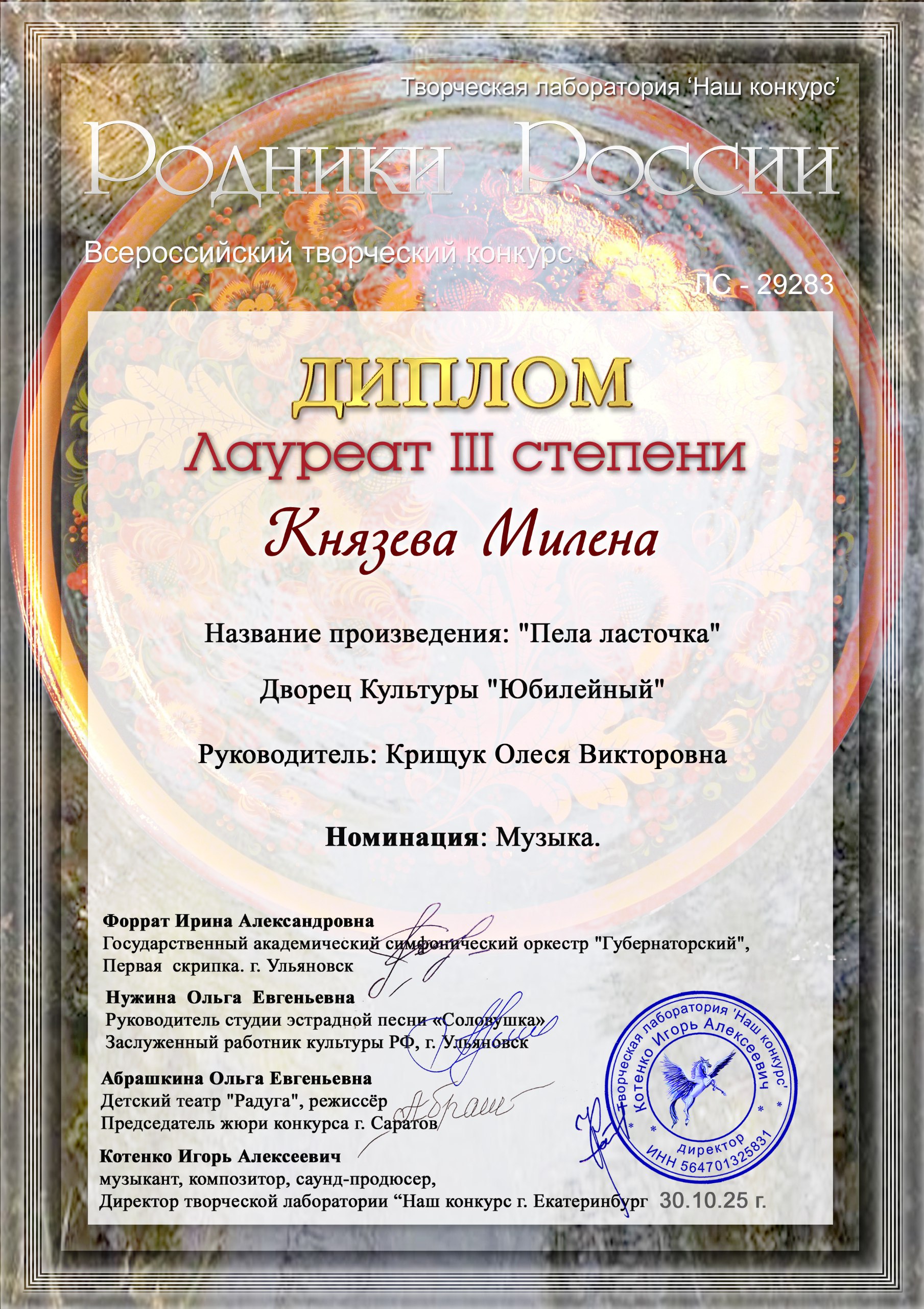 В Екатеринбурге прошел Всероссийский творческий конкурс «Родники России». Солистка вокальной группы «Жемчужные нотки» Милена Князева стала лауреатом 3 степени с композицией «Пела ласточка». Руководитель Олеся Викторовна Крищук была удостоена благодарственным письмом.