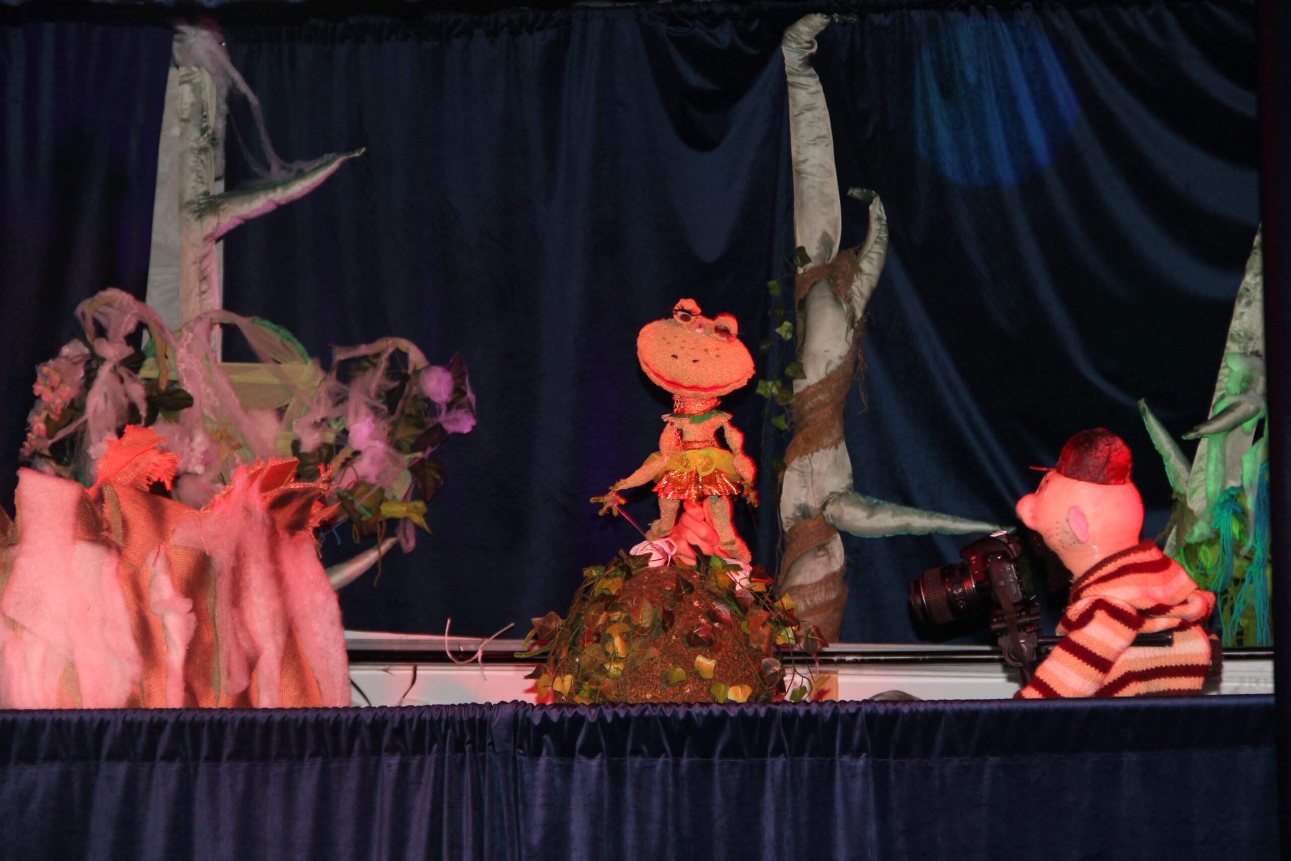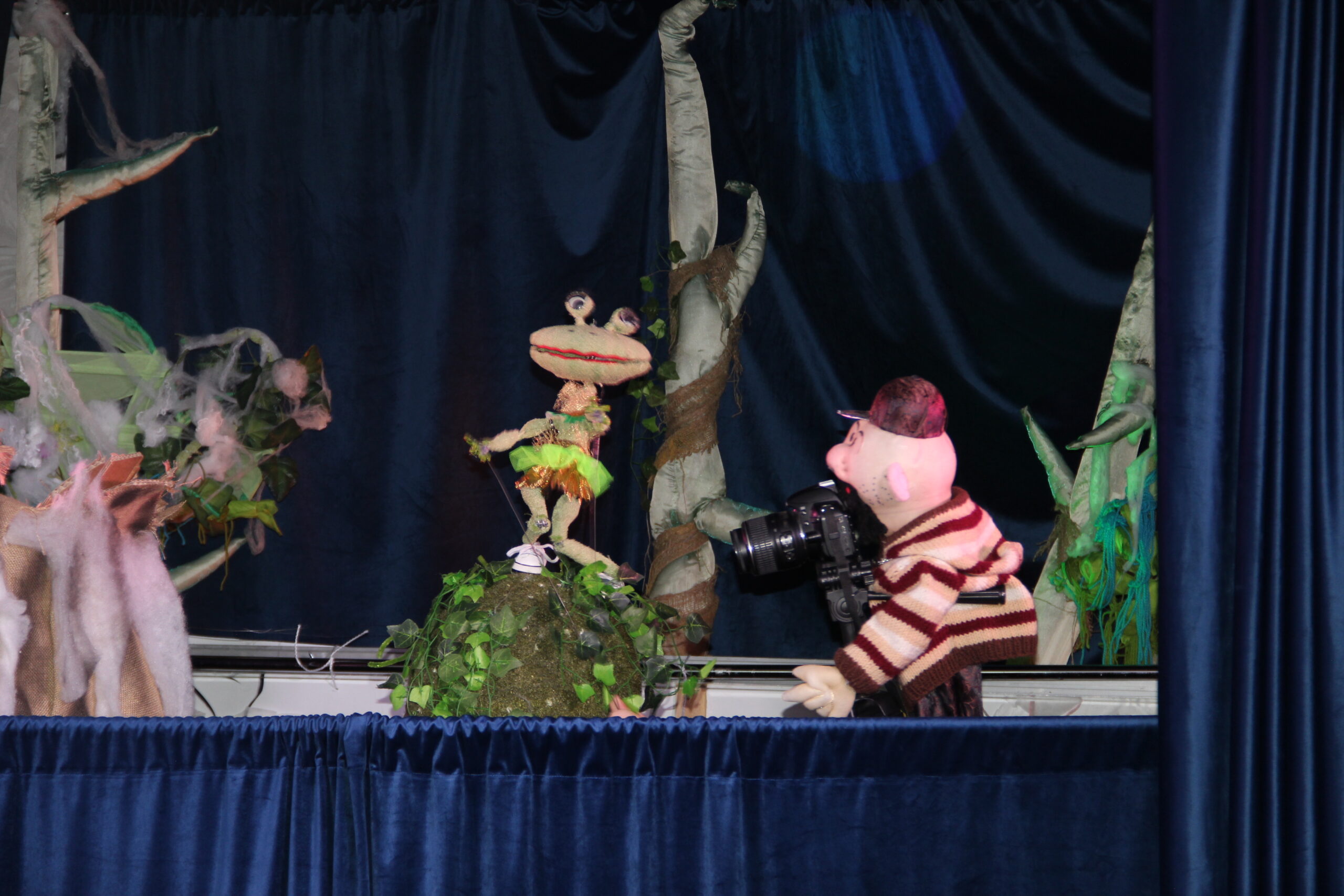 Для детей из детского сада №30 новогодние праздники продолжаются. Сегодня они посмотрели представление кукольного театра «Хохлома» «Новогодние каникулы». Снегурочка поехала в лес к Деду Морозу и заблудилась. Как обычно в сказках, не обошлось без колдовства. Кикимора сначала пыталась заколдовать Снеговика, потом переоделась в него… а лесные жители с Лешим помогли Снегурочке найти дорогу. Яркие декорации, красивые костюмы на куклах, зажигательные мелодии создали атмосферу праздника.