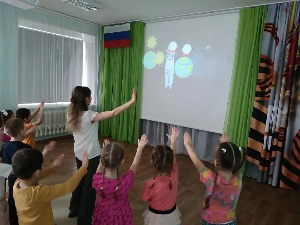 Воспитанникам детского сада было рассказано о первом полёте в космос, о космонавтах : Гагарине, Титове, Романенко, Терешковой и др. Дети с интересом на глобусе находили свою страну и указывали местоположение океанов.