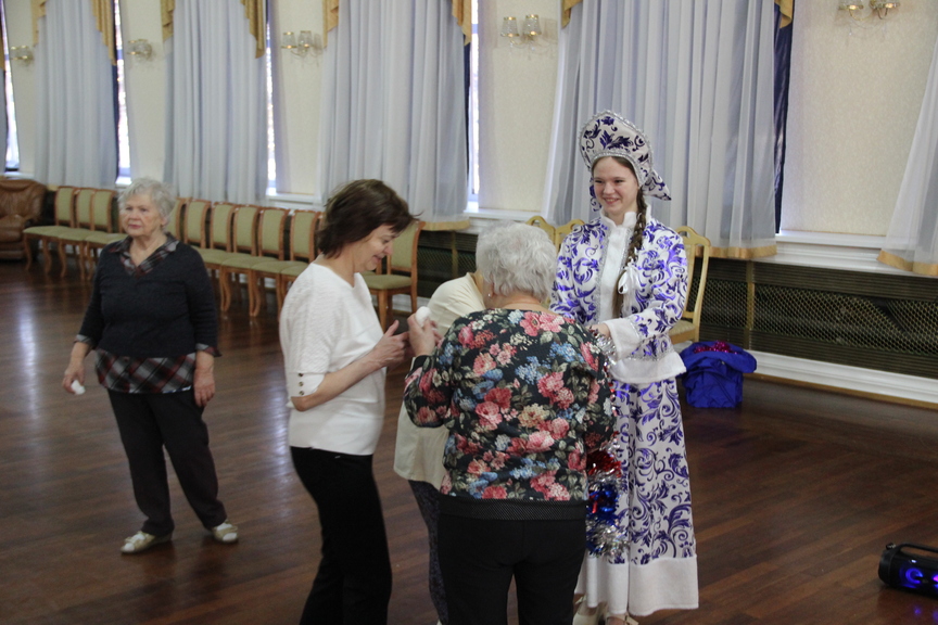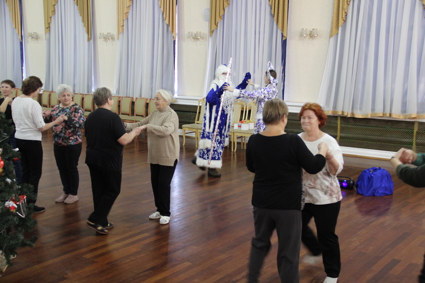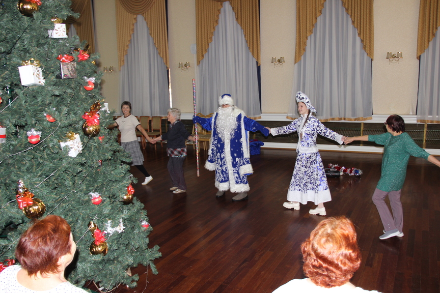 Участницы клуба дружно водили хороводы, играли в игру на меткость и внимание, танцевали и читали стихи. За это их наградили вкусными новогодними подарками.